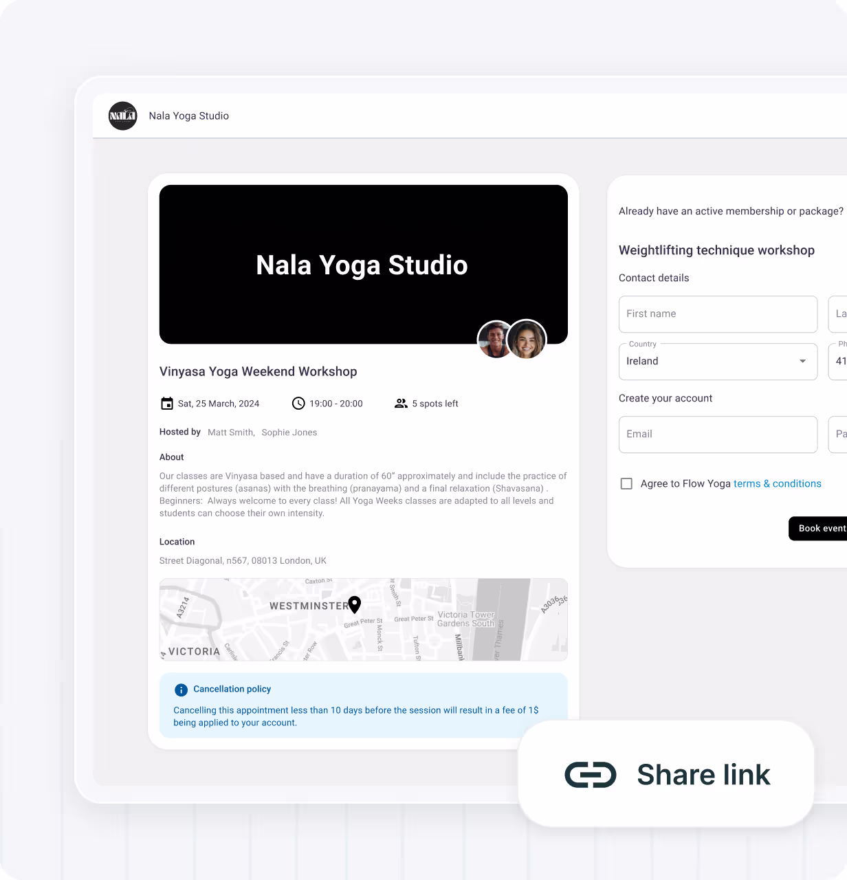 Embed class, event, and membership links on your website or share via email and WhatsApp. Remove signup barriers and increase bookings for your studio.